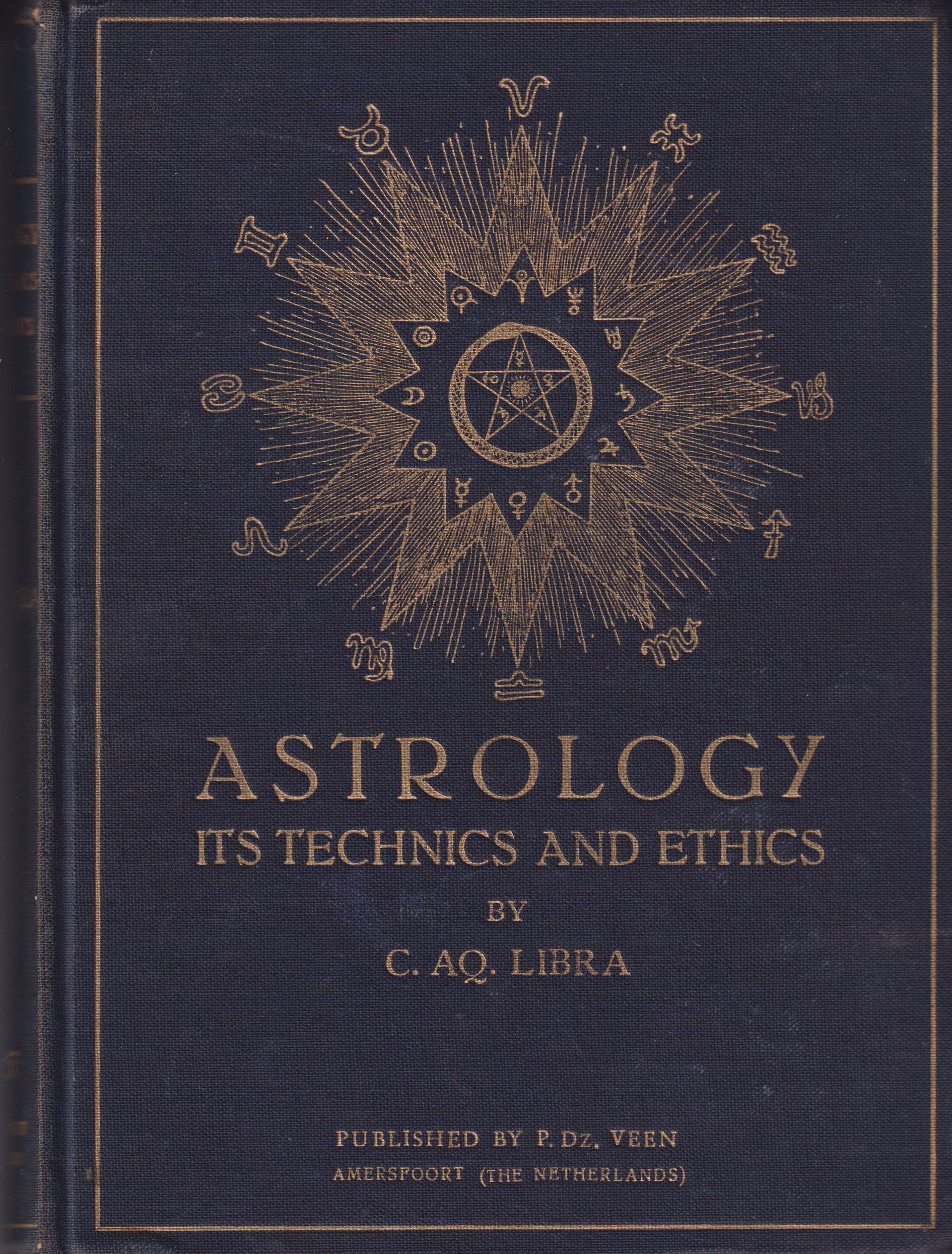 C. Aq. Libra | Astrology: its Technics and Ethics | P. Dz. Veen | 1917 | Ex-library copy, with shelfmark on spine, blindstamp on back panel, faint trace of carefully removed labels on front pastedown, & date stamp on rear endpaper. Despite this provenance, the book does not show any significant sign of use apart from a small, apparently accidental, ink mark in the margin of one page. A UK distributor’s label for L. N. Fowler & Co. has been rather clumsily stuck onto the foot of the title page. | £30